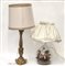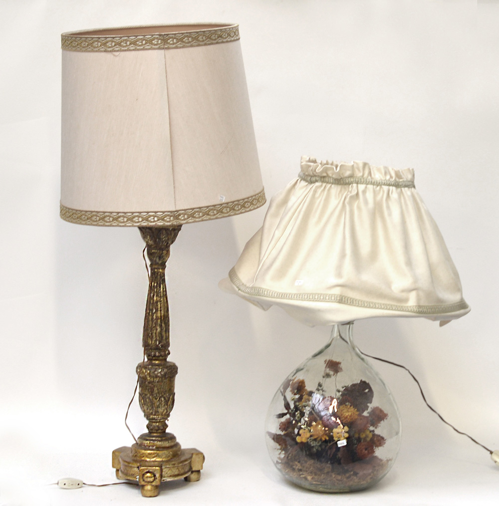 Lotto composto da un candelieri in legno dorato e una bottiglia in vetro, montata a lampada con paralumi (difetti)