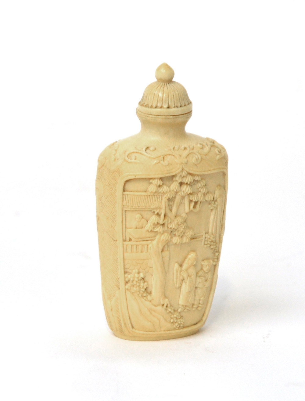 Snuff-bottle in avorio scolpita con paesaggi e figure. Cina, inizio sec. XX