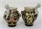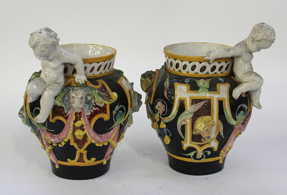 Manifattura di Faenza, inizio secolo XX. Coppia di vasi in ceramica policroma decorati in rilievo a grottesche sormontate da putti a tutto tondo (h. cm 40) (lievi difetti)