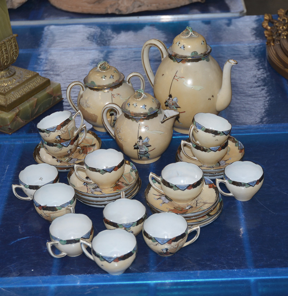 Servizio da caffè in porcellana policroma decorata con samurai e figure,...