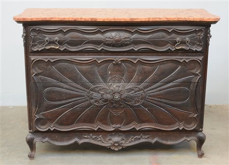 Cassettone a tre cassetti intagliato sul fronte "a ragnatela", grembiale decorato a valva di conchiglia, gambe sagomate (cm 134x103x56) Piemonte, secolo XIX (difetti)