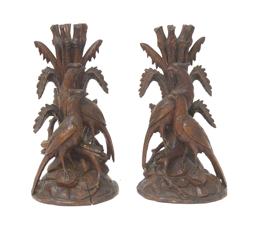 Due gruppi raffiguranti fagiani su tronchi d'albero in legno intagliato (difetti)