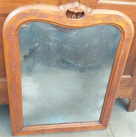 Specchio in legno inciso a motivi di frutta e foglie (h. cm 102) (difetti)