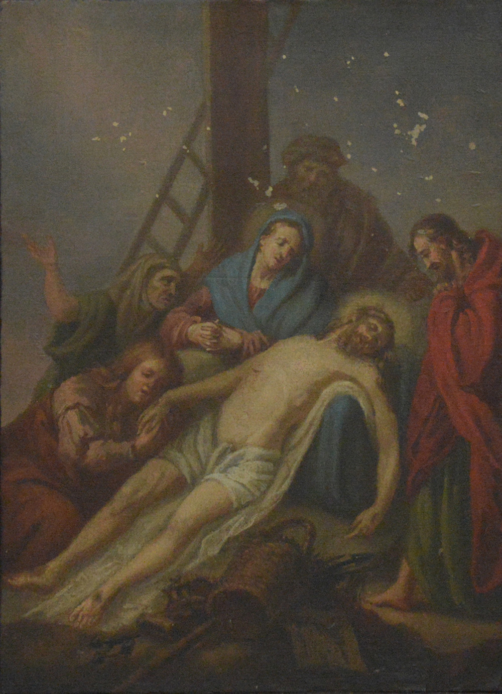 Scuola del secolo XVIII "Compianto su Cristo morto" olio su carta applicata su tela (cm 42x31) in cornice (difetti e restauri)