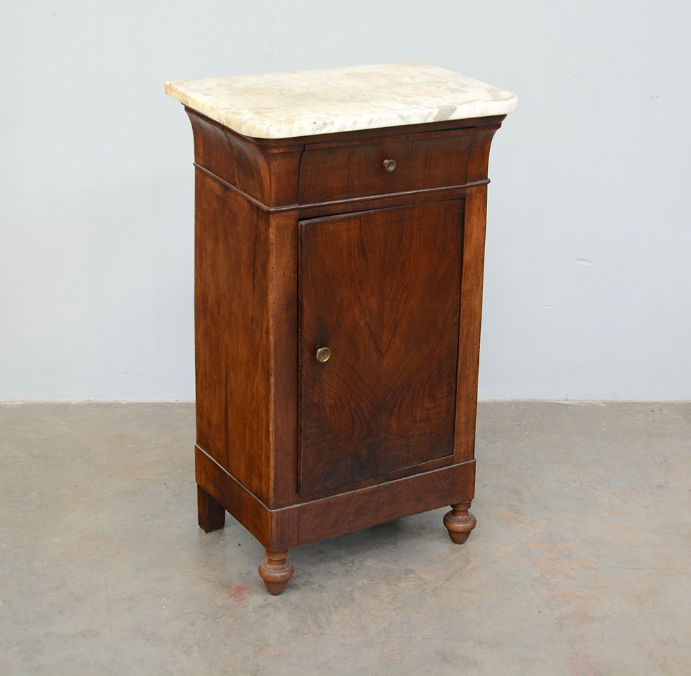 Comodino ad un'anta e un cassetto, piedi torniti e piano in marmo (cm 50x85x34,5) Secolo XIX (difetti)