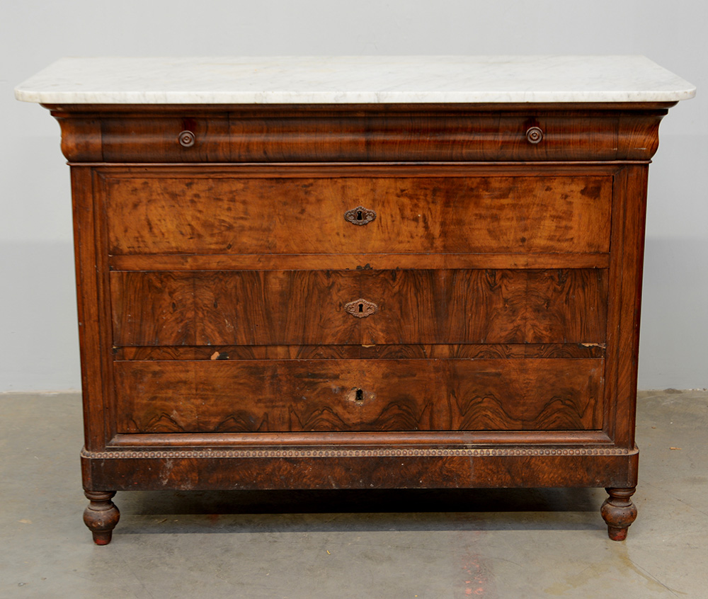 Cassettone lastronato in noce e radica a un cassetto sottopiano e tre grandi sul fronte. Piedi sagomati. Piano in marmo (cm 133x97,5x59) Secolo XIX (difetti)