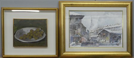 Lotto composto da un dipinto ad olio raffigurante "Uva" firmato L. Pascalino e un acquarello di firma indecifrata raffigurante "scorcio di Milano", in cornici (Difetti)