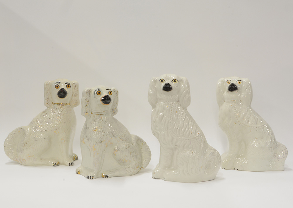 Manifattura inglese. Lotto composto da quattro sculture raffiguranti cani in ceramica (difetti)