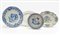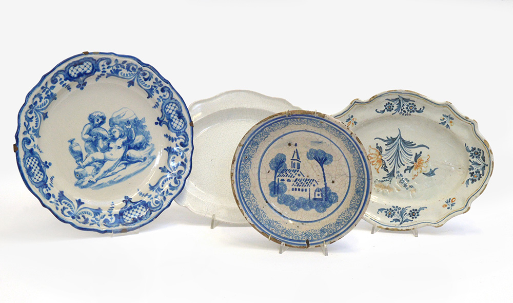 Lotto composto da una ciotola e tre piatti a bordo sagomato in maiolica di diversa epoca e decoro (difetti)