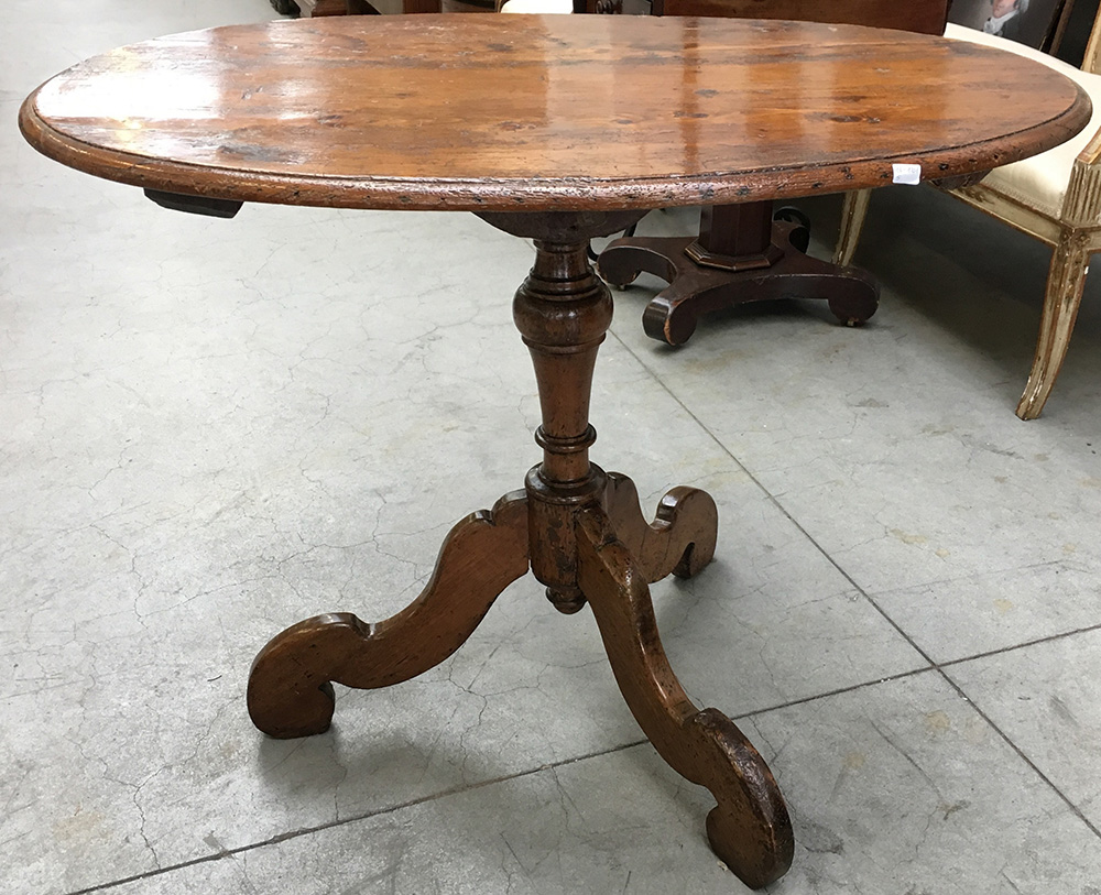 Tavolo a vela in noce con piano di forma ovale, gamba a colonna poggiante su piedi sagomati (cm 94xx70x66) (difetti)