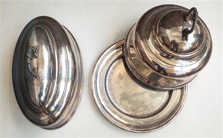Lotto composto da due coprivivande e un piatto tondo in metallo