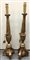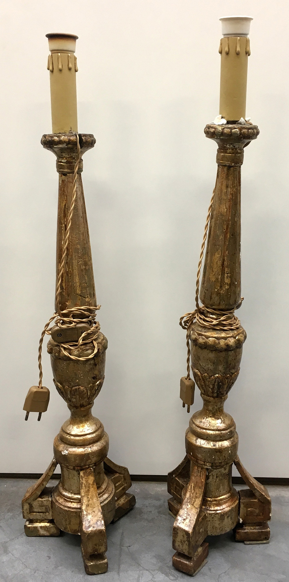 Coppia di torciere in legno laccato e dorato con fusto a colonna e base tripode. Secolo XIX (h. cm 62) (mancanze e restauri)