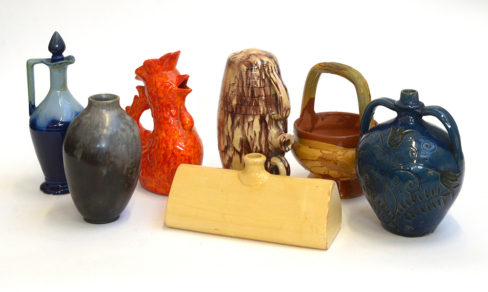 Manifatture diverse sec. XX. Lotto di sette oggetti di diversa forma e uso in ceramica smaltata (difetti)