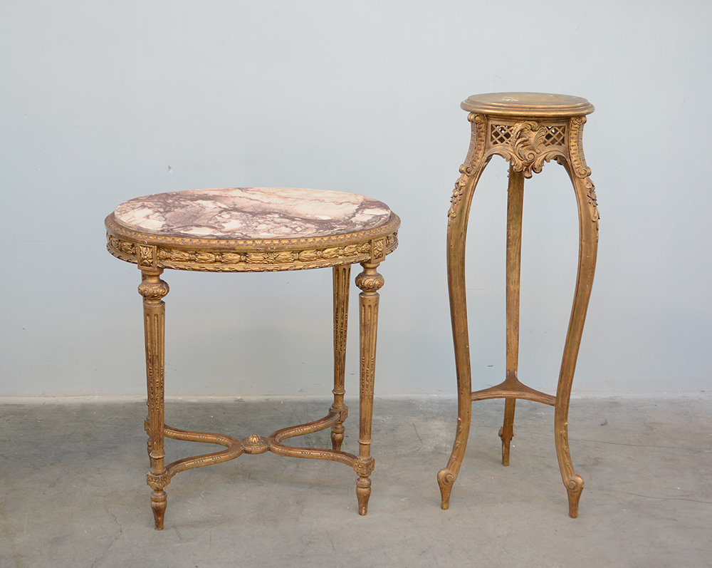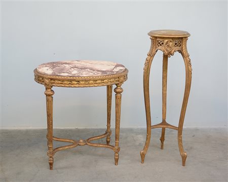 Lotto composto da un tavolino di forma ovale in legno scolpito e dorato con piano in marmo e gambe scanalate e rastremate riunite da traverse e un tavolino portavaso tripode in legno scolpito e dorato (difetti)