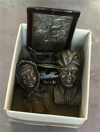 Cartone contenente un bassorilievo in bronzo raffigurante un segugio, due piccoli busti in legno intagliato e numerose sculturine in metallo a forma di animali (difetti)