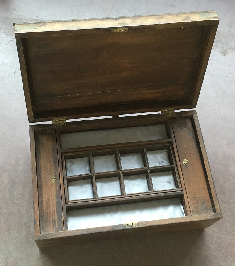Bauletto in legno con scomparti interni e guarnizioni in metallo (cm 47x21x30) (difetti)