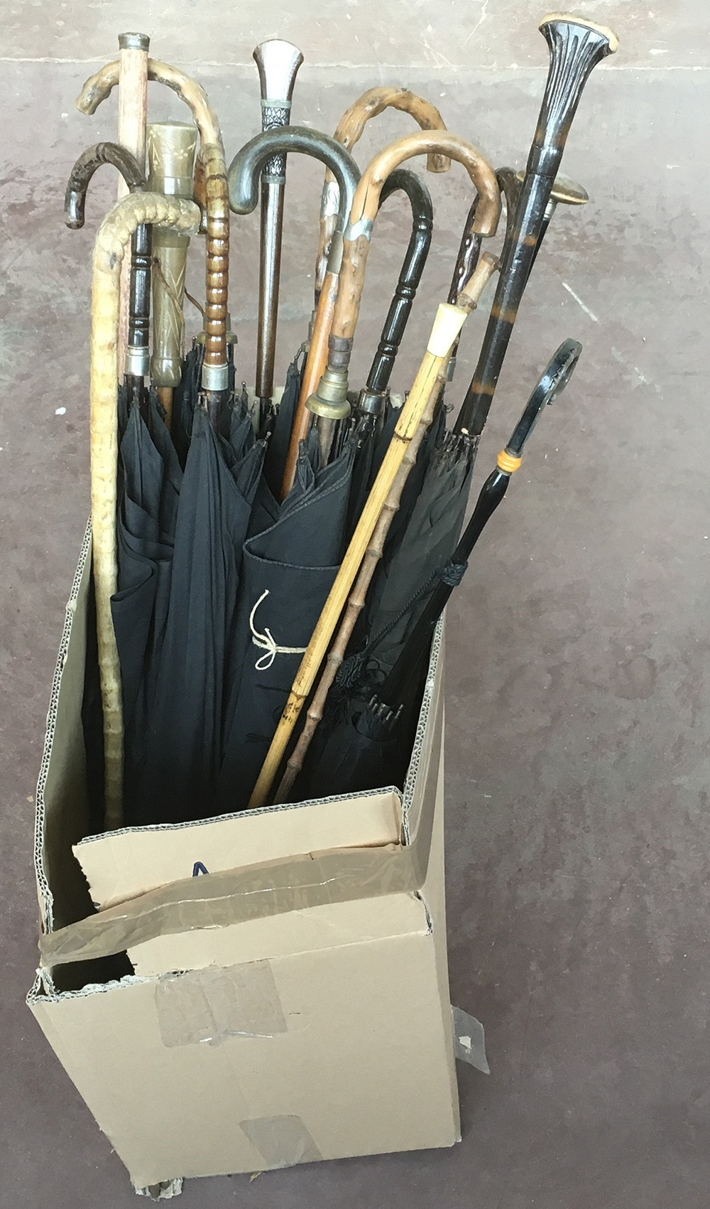 Cartone contenente numerosi ombrelli ed alcuni bastoni (difetti)
