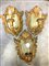 Gruppo di tre appliques ad una fiamma in legno laccato e intagliato a foglie,...