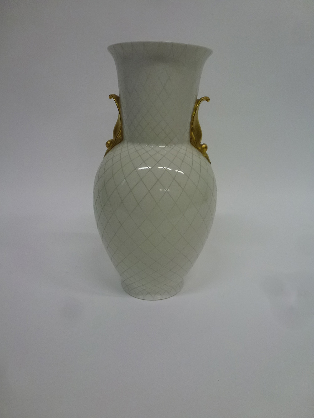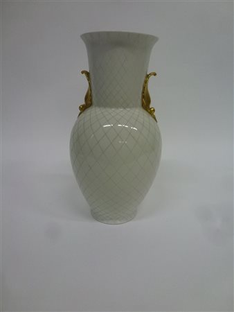 Vaso biansato in porcellana incisa a motivi romboidali, anse dorate a forma di conchiglia. Firenze, anni '30. Marcato sotto la base in Verde "Richard Ginori" e con il cartiglio dorato della Pittoria. (h cm 35,5) (lievi difetti)