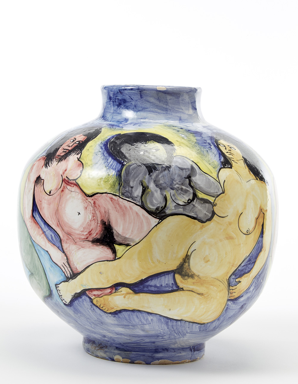 Polychrome enamelled ceramic vase with hand-painted female nudes subject. Santo Stefano Camastra, Italy, 1950s/1960s. Signed under the base. (h 35 cm.) (defects)