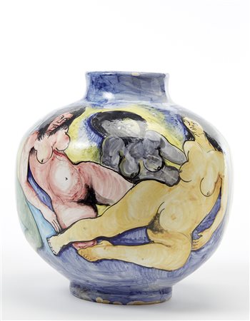 Vaso in ceramica smaltata in policromia con soggetto raffigurante nudi femminili dipinti a mano. Santo Stefano in Camastra, Italia, anni '50/'60. Firmato alla base e sotto la base. (h cm 35) (difetti)