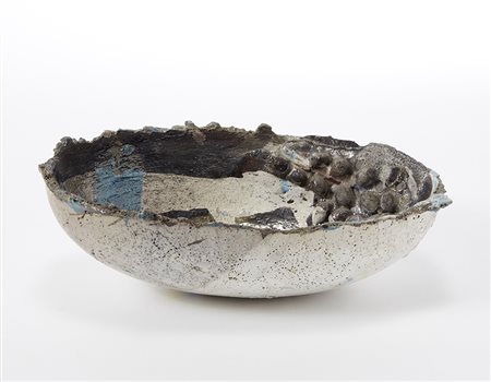 Scultura in grès smaltato a forma di semicalotta ellittica, smaltata in policromia e con decori informali in grigio, in celeste e a rilievo. Italia, seconda metà secolo XX. (l cm 32)