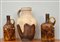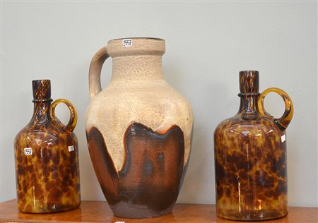 Brocca in ceramica smaltata a colature di produzione tedesca unita a due bottiglie in vetro soffiato ambrato e macchie brune. (difetti e restauri)