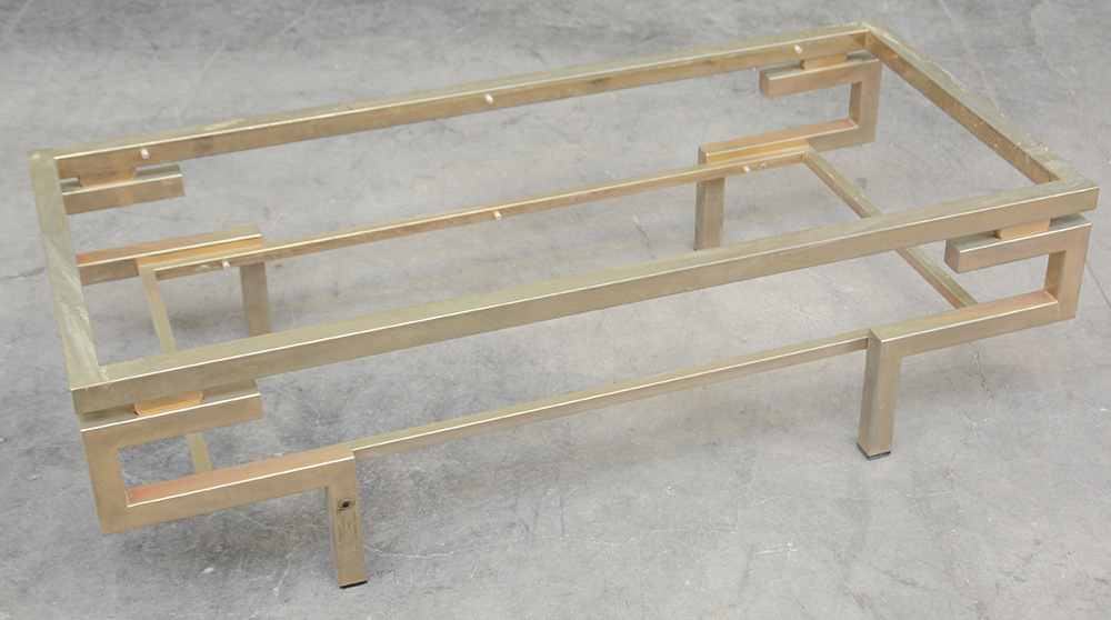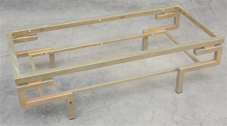 Tavolo basso con struttura in ferro ottonato a due ripiani rettangolari....