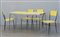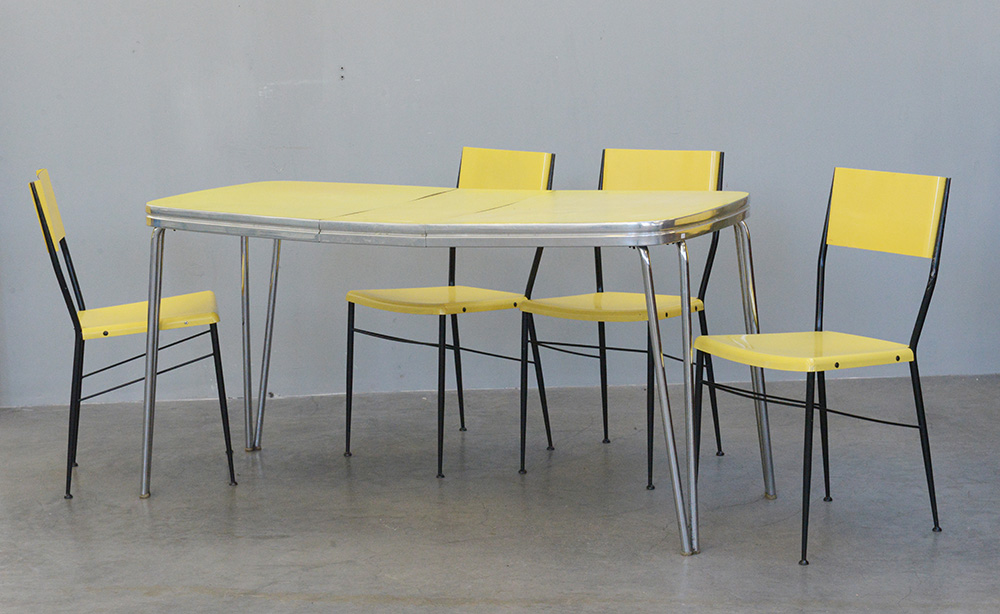Lotto composto da un tavolo e quattro sedie in alluminio, metallo cromato, matallo laccato nero e formica gialla. Italia, anni '60/'70. (Tavolo cm 150x77x72; sedie cm 41x83x47) (difetti)