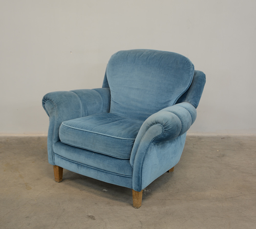 Poltrona imbottita con struttura in legno e rivestiento in velluto azzurro....