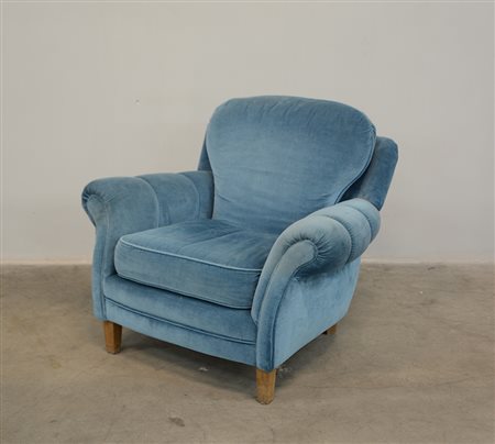 Poltrona imbottita con struttura in legno e rivestiento in velluto azzurro. Italia, secolo XX. (h cm 70) (lievi difetti)