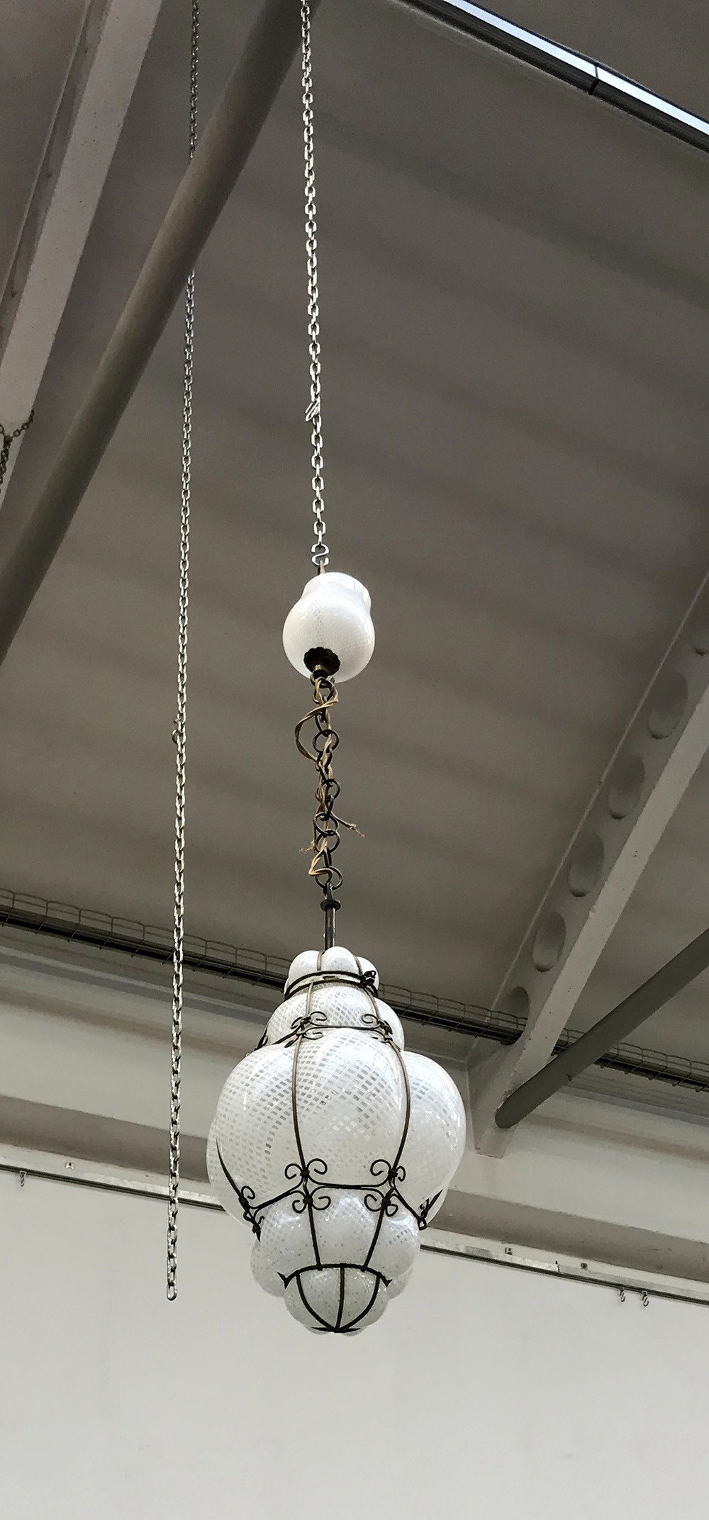 Lampada a sospensione a cesendello in vetro soffiato a reticello lattimo e ottone. Epoca recente. (h cm 68)