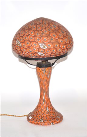 Lampada da tavolo in vetro soffiato a murrine fiorate arancioni, lattimo, blu, verde e incore. Montatura in ferro verniciato nero. Seconda metà secolo XX. (h cm 45)