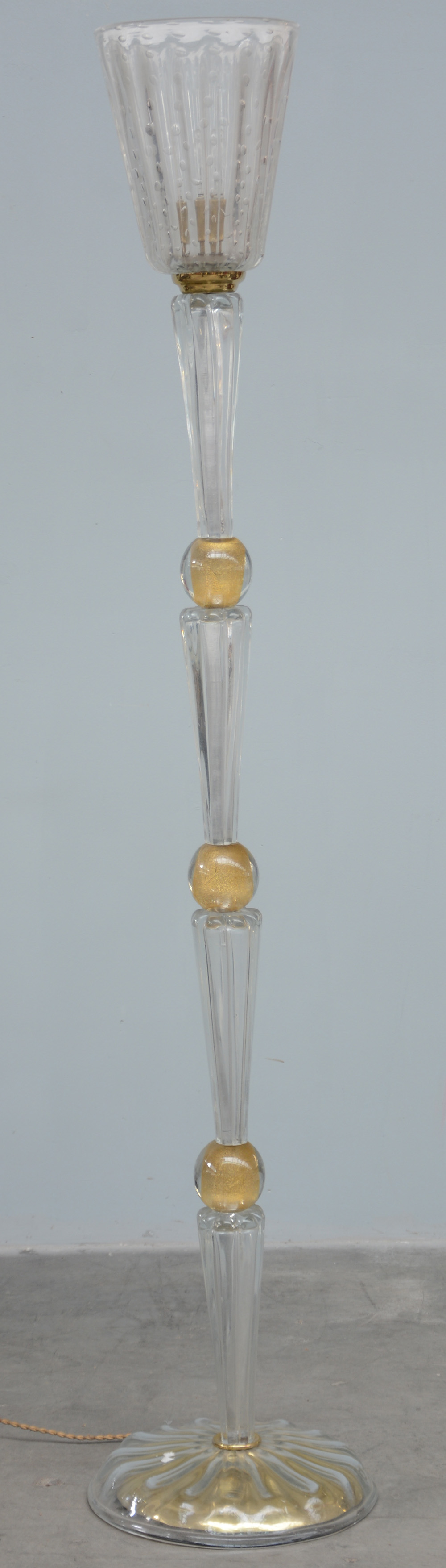 Lampada da terra in vetro soffiato incolore a grosse costolature, diffusore con inclusione di bolle, rocchi del fusto con inclusione di foglia d'oro. Epoca recente. (h cm 185) (lievi difetti e restauri)