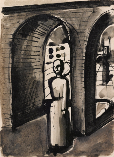 MARIO SIRONI 1885 - 1961 COMPOSIZIONE METAFISICA ink on paper. Executed in 1919 according to Francesco Meloni that has verbally confirmed the work authenticity inchiostro su carta cm 21x15 Eseguito nel 1919 secondo Francesco Meloni che ha confermato verbalmente l'autenticità dell'opera PROVENANCE Galleria Arco Farnese, Roma Ivi acquistato dall'attuale proprietario negli anni Ottanta EXHIBITED New York, Galleria Daverio, Sironi, 1989, pag. 75, illustrato Roma, Galleria Arco Farnese, Disegno italiano 1900-1960, 1991, n. 138, illustrato