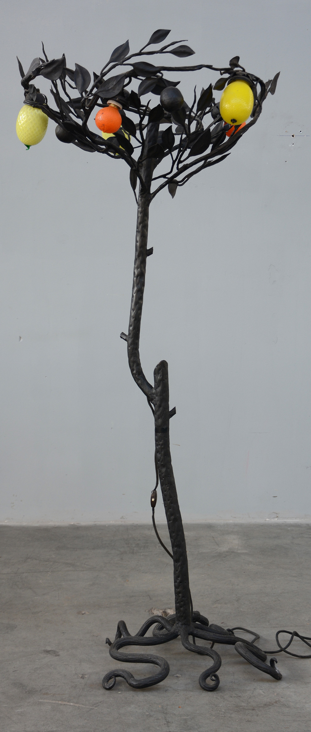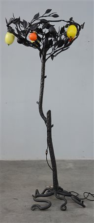 Lampada da terra in ferro battuto elettrosaldato a foggia di pianta di limone con lampadine e frutti in vetro policromo. Italia, seconda metà secolo XX. (h cm 168)