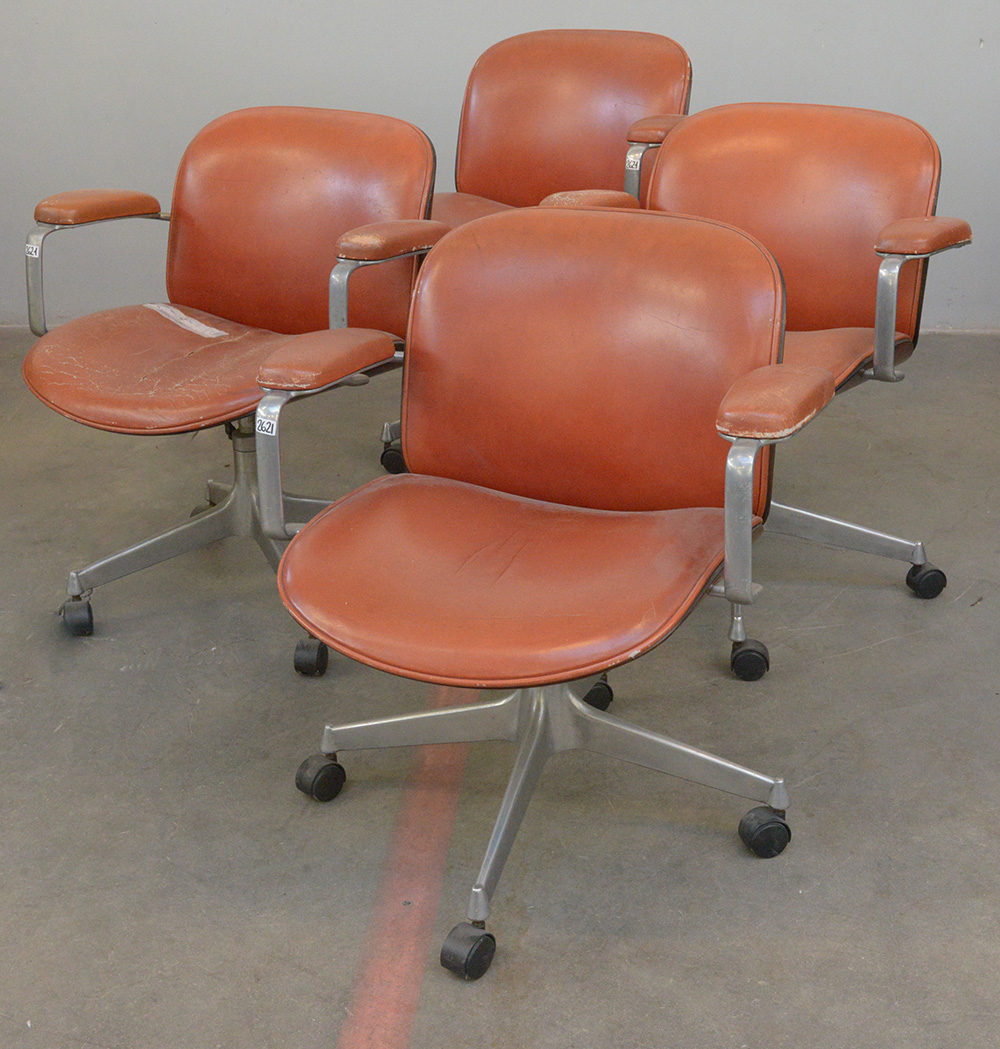 Quattro poltroncine da ufficio. Produzione MIM, Roma, anni '60. Alluminio pressofuso e multistrato piegato, rivestimento in pelle marrone. (difetti e mancanze)