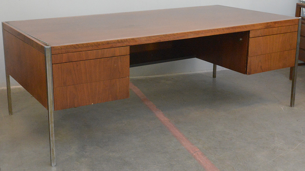 Grande scrivania da centro a sei cassetti. Produzione Knoll International, anni '60/'70. Struttura in acciaio cromato, fianchi e piano in legno filettato in acciaio. (cm 205x73x100) (difetti)