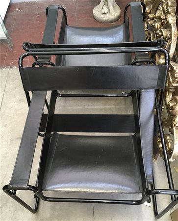 Coppia di poltrone modello modello "B3 o Wassily". Italia, anni '70. Tubo di metallo con verniciatura non originale e cuoio di colore nero. (difetti)