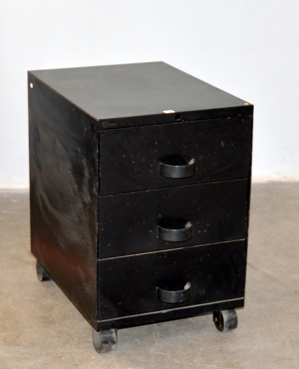 Cassettiera da ufficio a rotelle con tre cassetti in metallo laccato nero. Varedo, anni '70. (cm 40x60,5x56) (difetti)