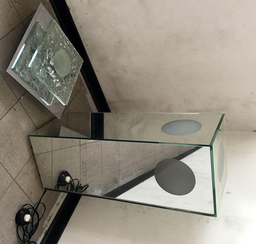 Lotto composto da una applique in acciaio con diffusore in vetro massello scalpellato e una lampada da terra a parallelepipedo con facce a specchio. Italia, anni '70. (difetti)