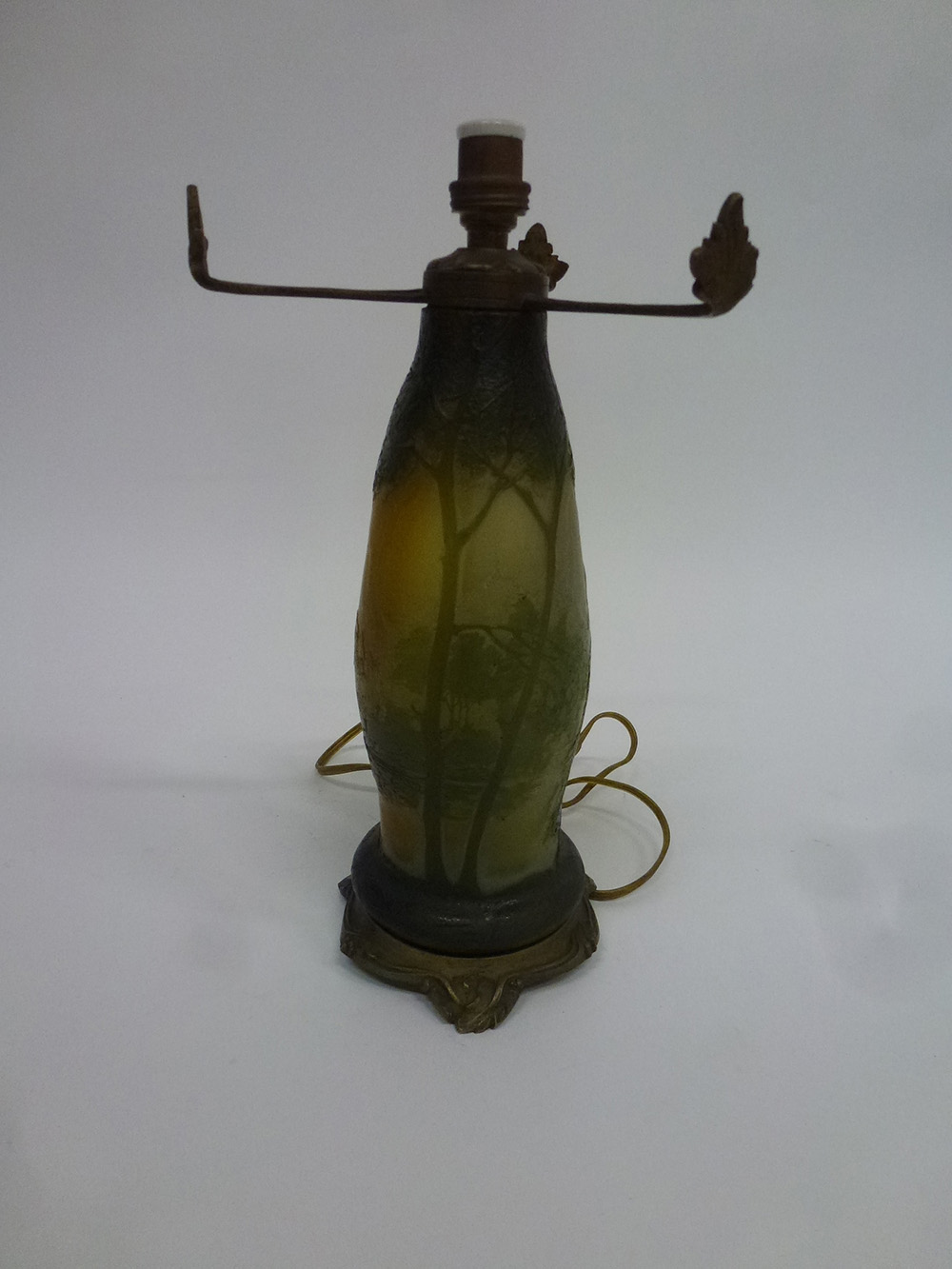 lampada da tavolo Art Nouveau in vetro cammeo corroso all'acido con decoro raffigurante paesaggio lacustre montatura in fusione di ottone. Francia, 1900 ca. (h cm 31) (lievi difetti e mancanze)