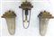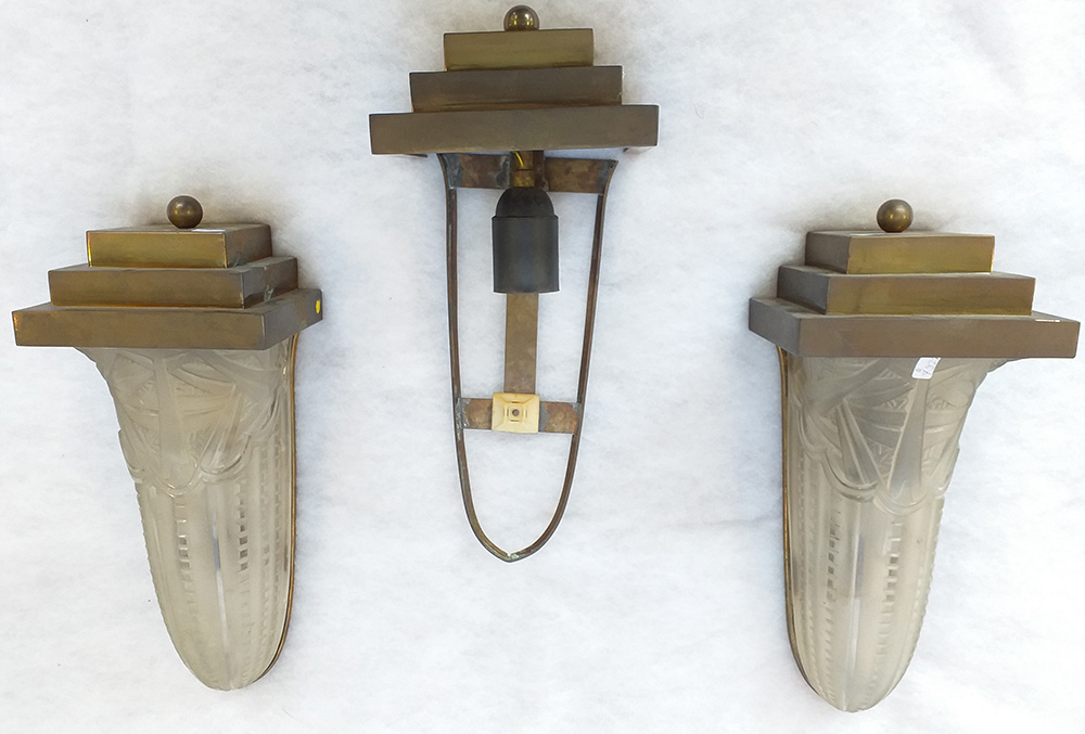Lotto di tre appliques déco con struttura in ottone e diffusore in vetro incamiciato soffiato in stampo acidato sulla superficie esterna e decorato con motivi geometrici. (h cm 33,5) (difetti e mancanze)