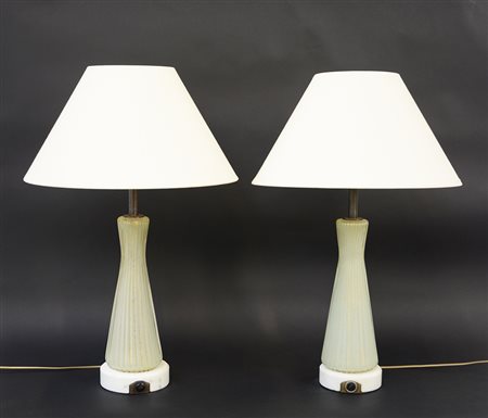 Manifattura di Murano, coppia di lampade da tavolo con paralume e fusto in vetro soffiato scanalato con inclusione di foglia d'oro, base in marmo di Carrara. (h cm 50) (lievi difetti)