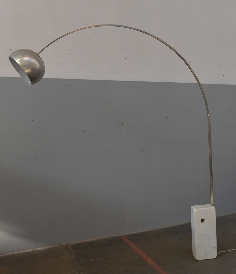 Lampada da terra modello "Arco ". Produzione Flos, Italia, 1962. composta da una base parallelepipeda in marmo bianco, uno stelo curvato a tre settori in acciaio e un paralume in acciaio e alluminio forato. (difetti)