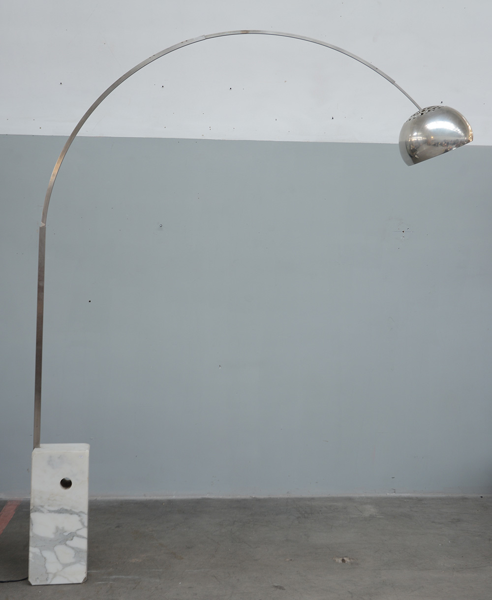 Lampada da terra modello "Arco ". Produzione Flos, Italia, 1962. composta da una base parallelepipeda in marmo bianco, uno stelo curvato a tre settori in acciaio e un paralume in acciaio e alluminio forato. (difetti)