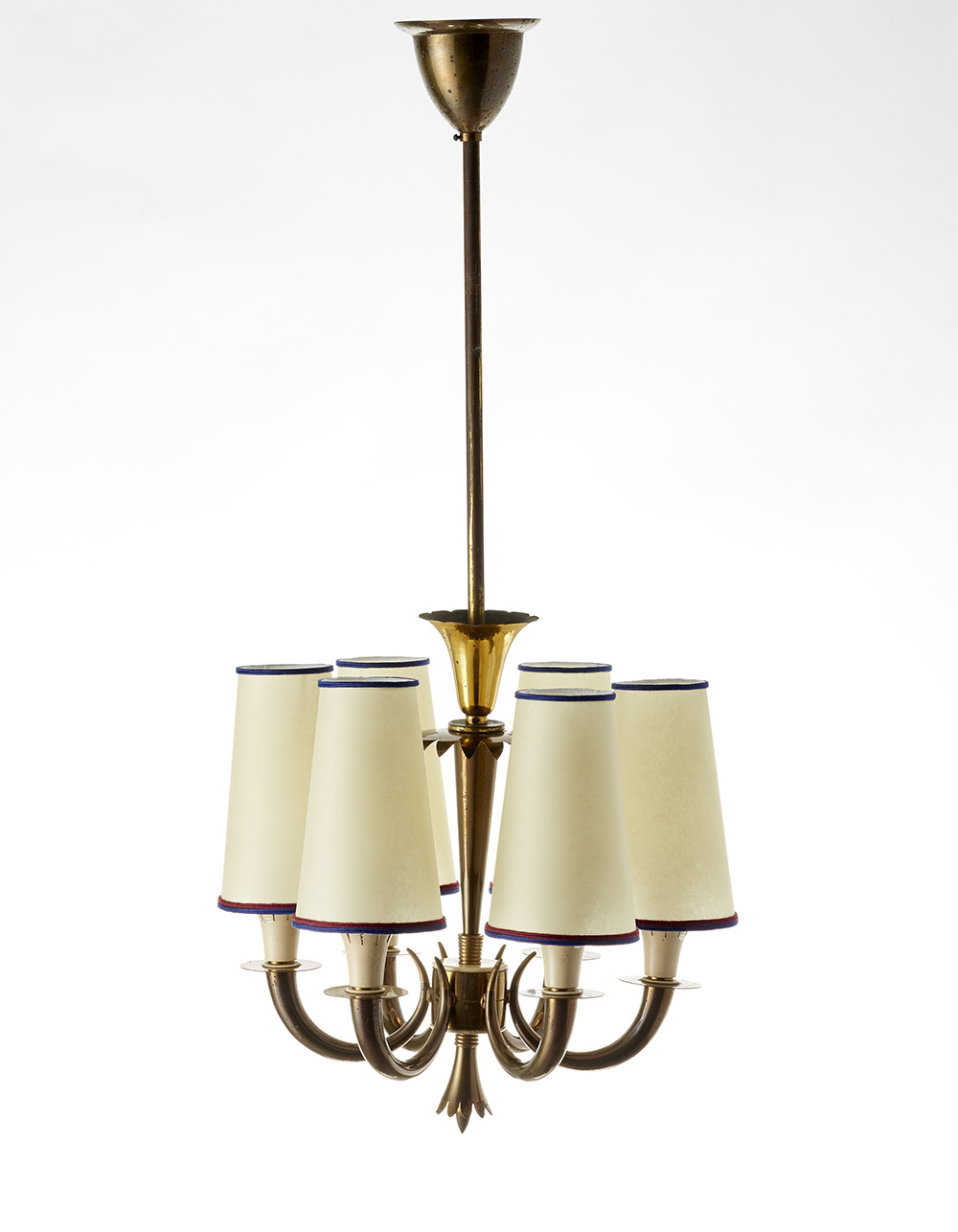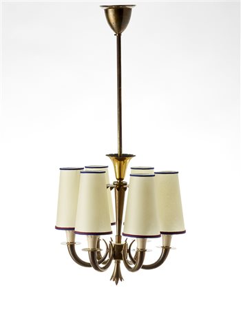 Piccolo lampadario Novecento a sei luci. Milano, anni '20. Ottone lucidato e alluminio laccato bianco. (h cm 87) (lievi difetti)
