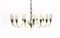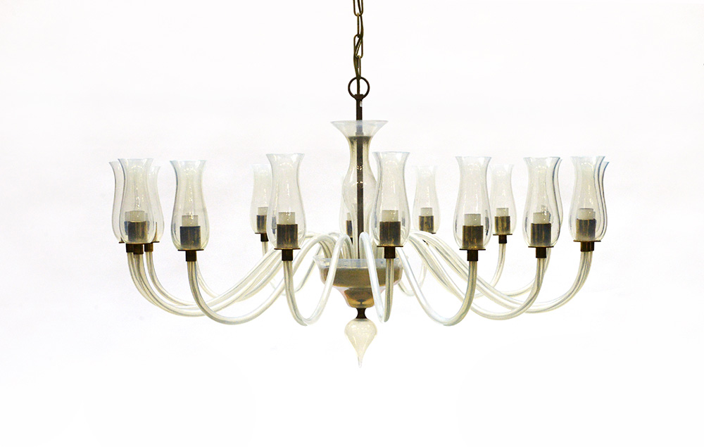 Lampadario a sedici braccia in vetro soffiato opalescente con portalampadine in ottone lucidato. Anni '80/'90. (h cm 106; d cm 89) (lievi difetti)