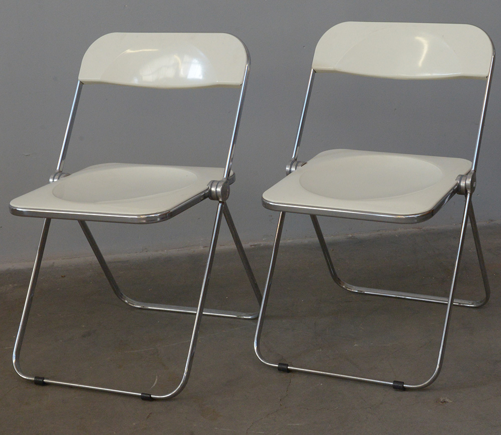 Coppia di sedie pieghevoli modello "Plia". Produzione Castelli, Bologna, 1970. Acciaio e plastic bianca. (gravi difetti)
