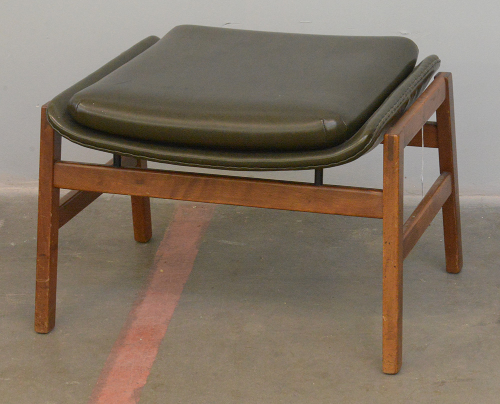Sgabello modello "849/S". Produzione Cassina, Meda. Struttura in legno massello e seduta in similpelle verde oliva. (cm 62x43x48) (lievi difetti)